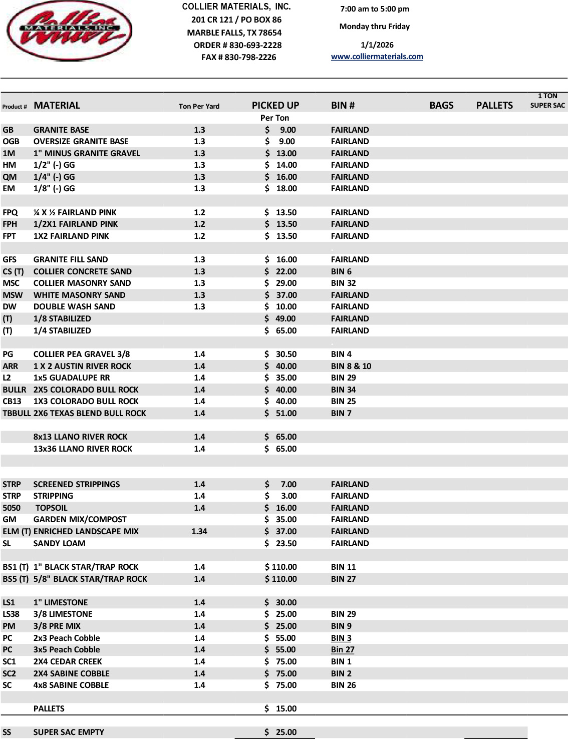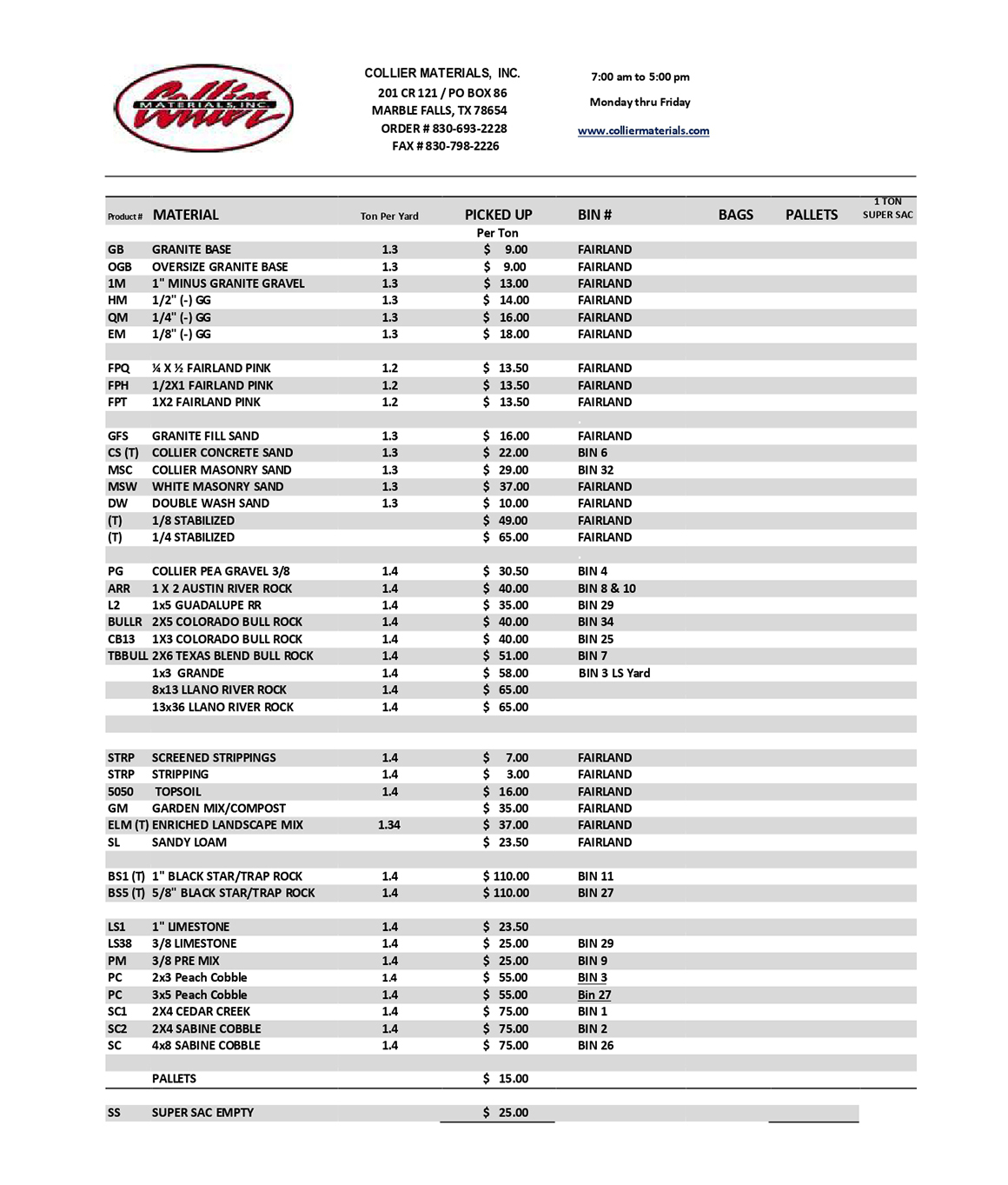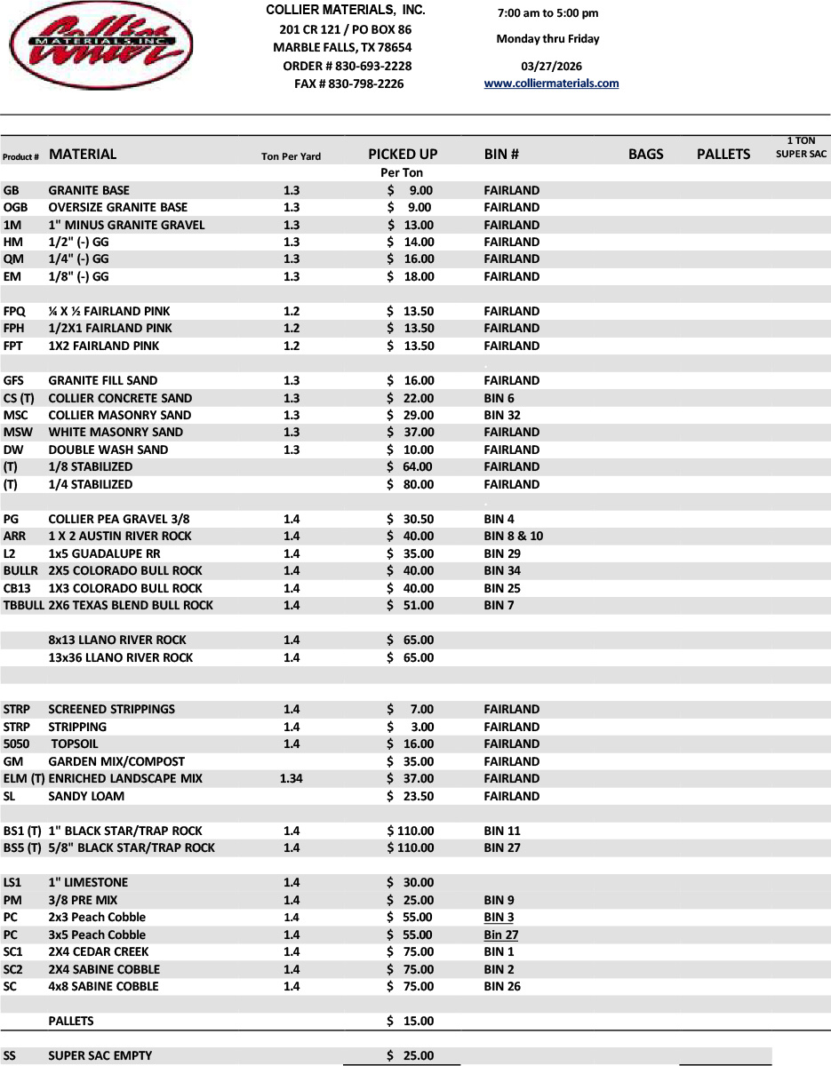All Listed Prices Are For Pick Up - Call For Delivery Charge