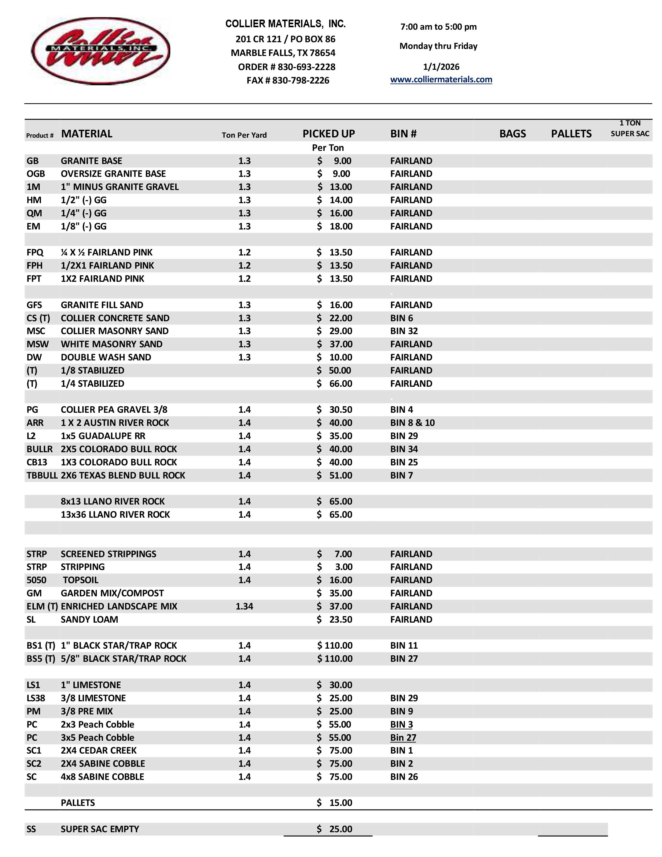 All Listed Prices Are For Pick Up - Call For Delivery Charge